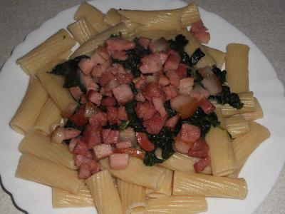 паста (в моем варианте пенне) , упаковка замороженного шпината (пр. 300 гр.) , 200 - 300 гр. грудинки.