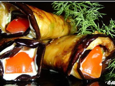 Рулетики из баклажанов с помидорами